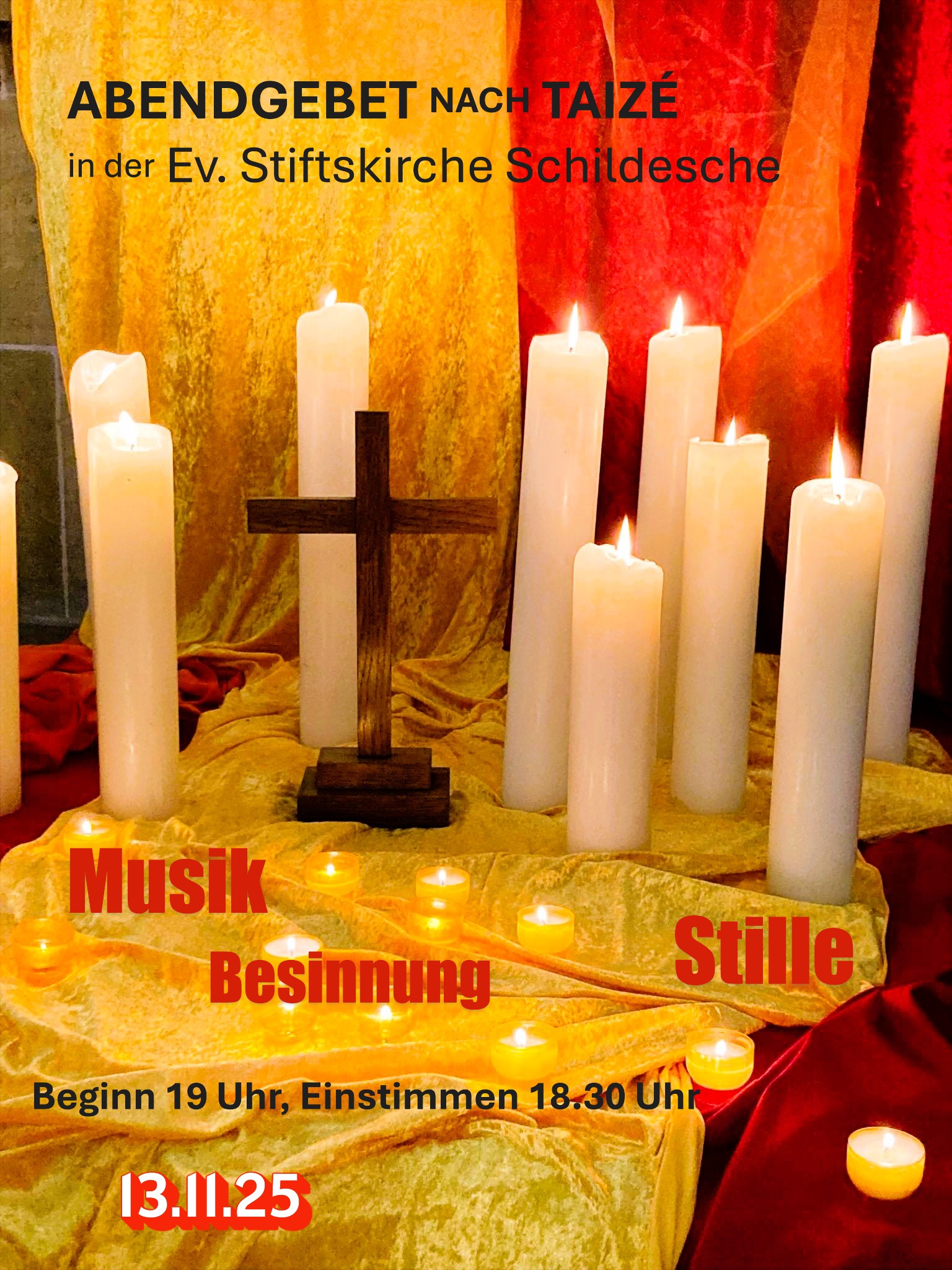 Ursprünglich aus der ökumenischen Bruderschaft in Taizé/Frankreich kommend, wird diese Form der christlichen Meditation heute auf der ganzen Welt gefeiert. Einfache Lieder, die mehrfach wiederholt und oft mehrstimmig gesungen werden, bilden den Rahmen. Dazwischen gibt es eine Zeit der Stille, kurze Texte und Raum für Gebete.