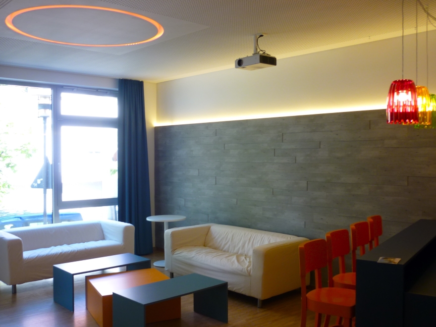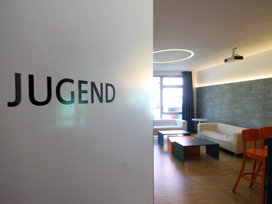 Für die Jugend gibt es einen eigenen Bereich im Gemeindehaus. Und auch das Gemeindebüro und die Küche sind von der Eingangshalle aus zu erreichen.