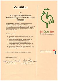 Das Audit konnte erfolgreich abgeschlossen und die Stiftskirchengemeinde am 18. Februar 2024 mit der Überreichung der offiziellen Auszeichnungsurkunde durch Herrn Dr. Waesch und Herrn Hörner mit dem Grünen Hahn im Rahmen des Gottesdienstes, im Beisein des Superintendenten, zertifiziert werden.