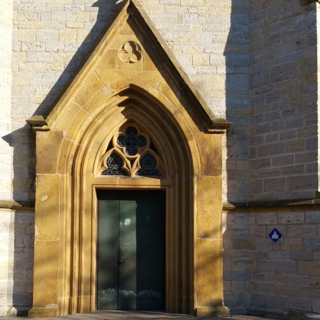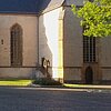 Ein Rundgang um das Äußere der Kirche lohnt sich ebenfalls. Am interessantesten ist die zum Kirchplatz gelegene Südseite. Hier fällt Ihr Blick auf die steinerne gotische Friedhofslaterne (s. Abbildung). Sie erinnert noch daran, daß der Platz ehemals ein Friedhof war.